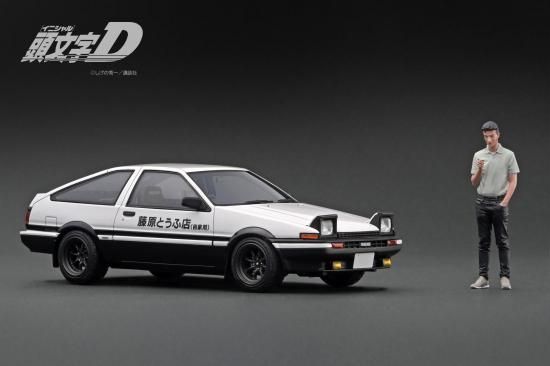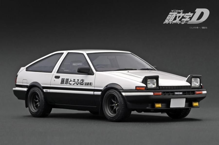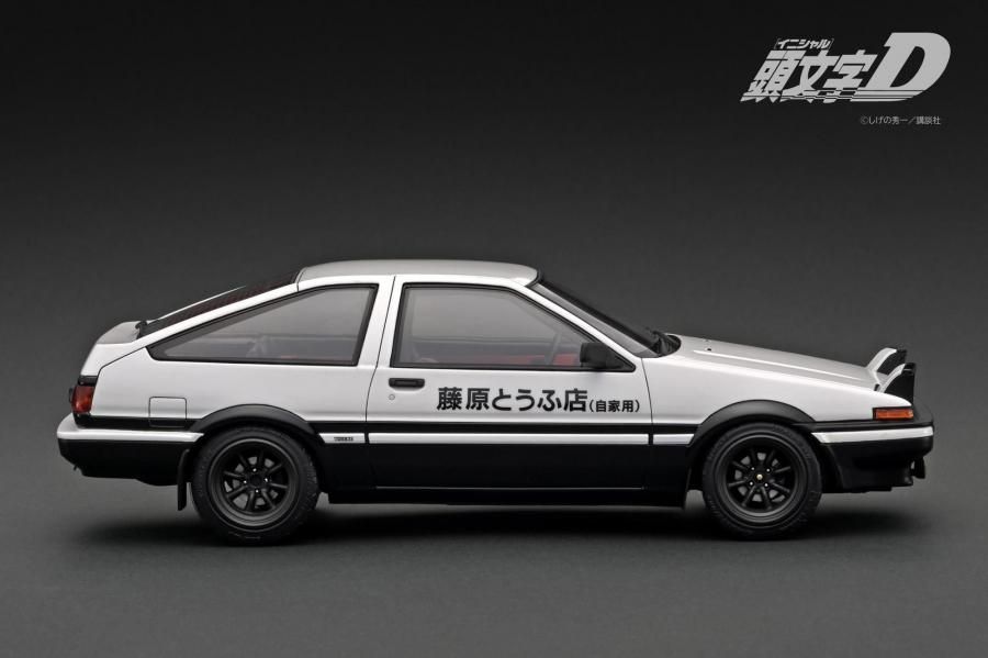 コミックス版「頭文字D」に登場する藤原拓海の愛車「3ドア トレノ(AE86)」を1/18スケール レジンモデルで再現。15インチ8本スポークホイールにローダウン仕様。フォグランプ、シングルマフラー、運転席側ドアに「藤原とうふ店」のデカール再現、運転席のみバケットシート、イタルボランテタイプステアリング、ダッシュボードに後付の水温計、油温計、タコメーターを装着。