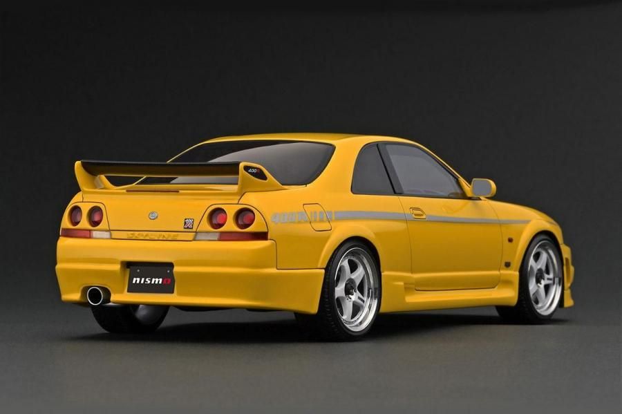 「NISMO 400R (BCNR33)」を1/18スケールレジンモデルで再現。NISMO LM-GT1 18インチホイール(ホワイト)にローダウン仕様。400R専用エアロパーツ(フロントバンパー、サイドステップ、リヤスポイラー)、専用エンブレム、専用バケットシート、専用ステアリング、大径マフラーを装着。※画像は試作品です。