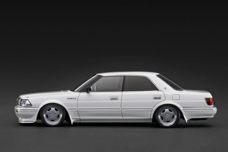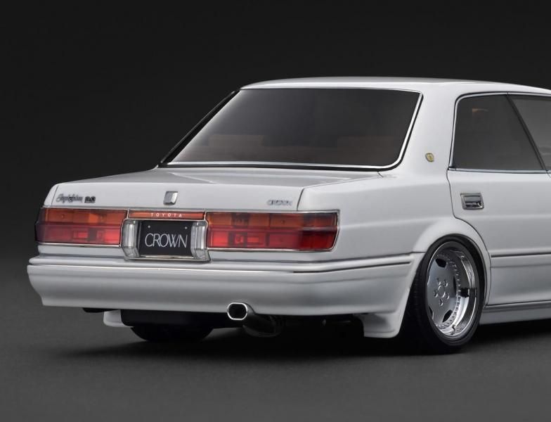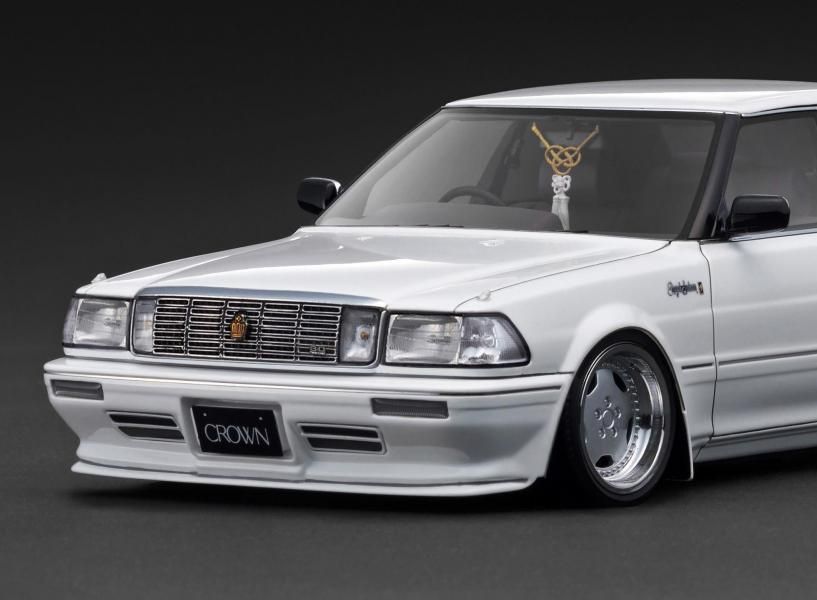 「CROWN Royal Saloon G (130)」を1/18スケールレジンモデルで再現。ボディカラー:ホワイト。内装カラー:ブラウン。Stichタイプ17インチホイール(ポリッシュ&シルバー)にローダウン仕様。フロントリップスポイラー、大径シングルマフラー、純正シート、ナルディタイプステアリング(ブラック)装着。ルームミラーに吊り下げた「房(ふさ)」が雰囲気です。※画像は試作品です。