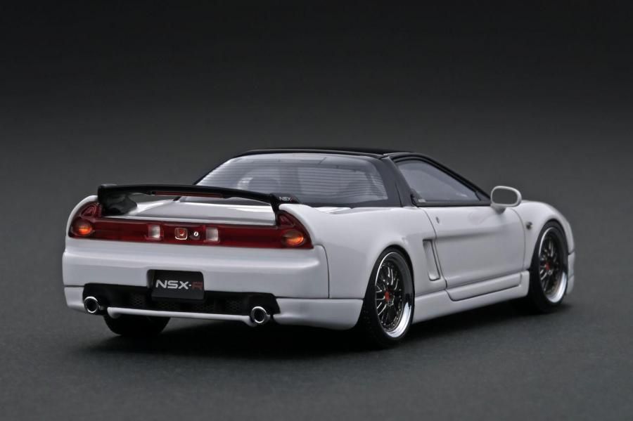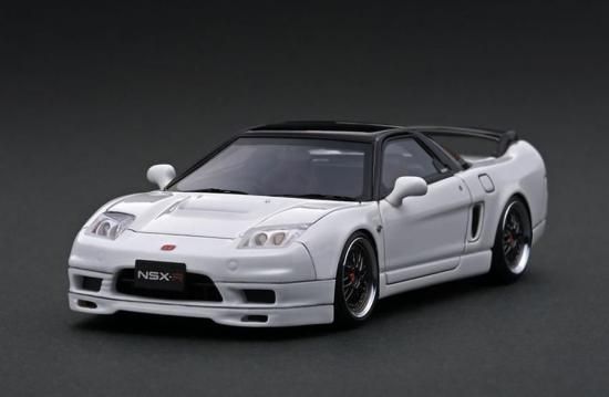 NSX-R(NA2)をベースにしたカスタム仕様を1/43スケールレジンモデルで再現。BBS LMタイプ18インチホイール(ポリッシュ&ガンメタリック)にローダウン仕様。フロントリップスポイラー、リヤスポイラー、リヤディフューザー、左右出し大径マフラー、バケットシート、モモタイプステアリング装着。