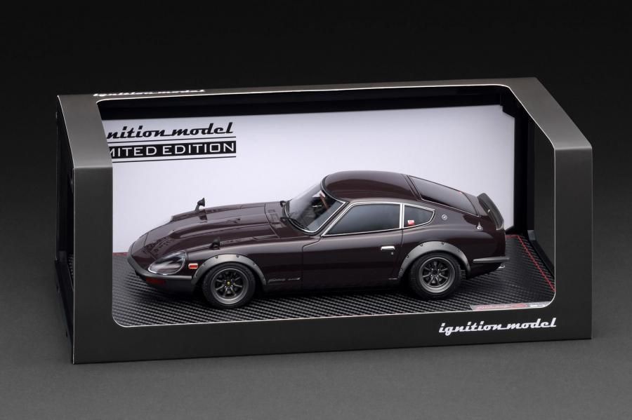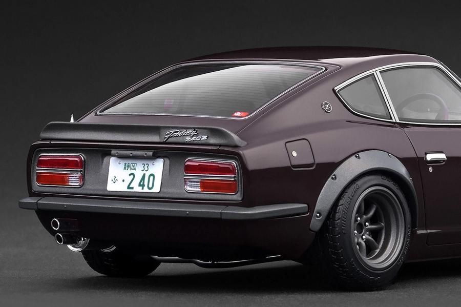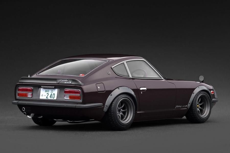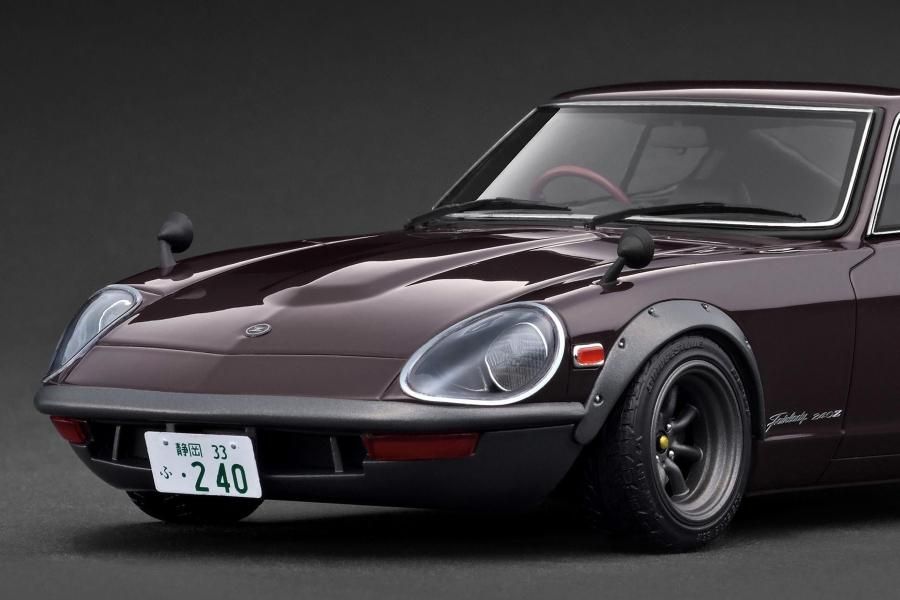 「Fairlady 240ZG (HS30)」を1/18スケールレジンモデルで再現しました。ボディカラー:マルーン。RSワタナベ エイトスポーク 15インチホイール(ガンメタリック)にローダウン仕様。リヤスポイラー、前後オーバーフェンダー、縦デュアルマフラーを装着。クォーターウィンドウに「OK」マーク、リヤウィンドウ下部に「有鉛」マークを貼付し細部のリアリティを追及。ハンドルやシート等、内装の装備品はノーマルです。今回、ナンバープレートに「静岡 33 ふ・240」を再現したWEB限定 特別仕様です。実車の3Dスキャニング取材を実施しオリジナルデフォルメによって仕上げた240ZGの流麗なボディデザインと定番のライトカスタムにご注目ください。