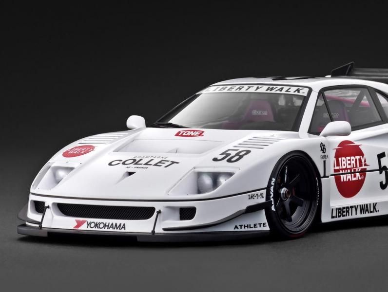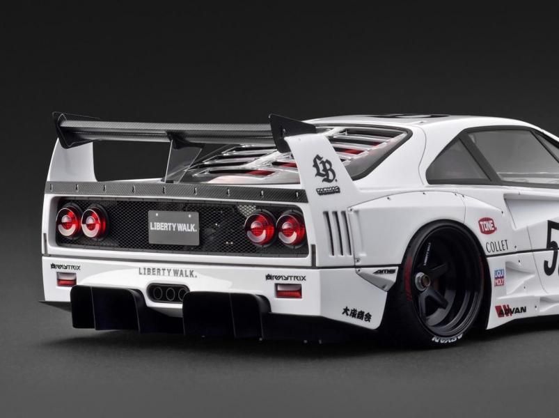 最新仕様のリバティウォークのデモカー「LB-WORKS 40」を1/18スケールレジンモデル素材でモデル化しました。ボディカラー:ホワイト。LB-worksオリジナル6本スポーク18インチホイール(ブラック)に専用ボディキット(フロントリップスポイラー、フロントカウル、リヤワイドフェンダー、リヤウィング、リヤディフュ—ザー、カナード)、ボディの各所に専用デカール、内装に専用バケットシート、LB-worksオリジナルステアリング、ロールバーを装着。リヤハッチの内部に収まるV8ツインターボエンジンを詳細に再現しました。 ※画像は試作品です。
