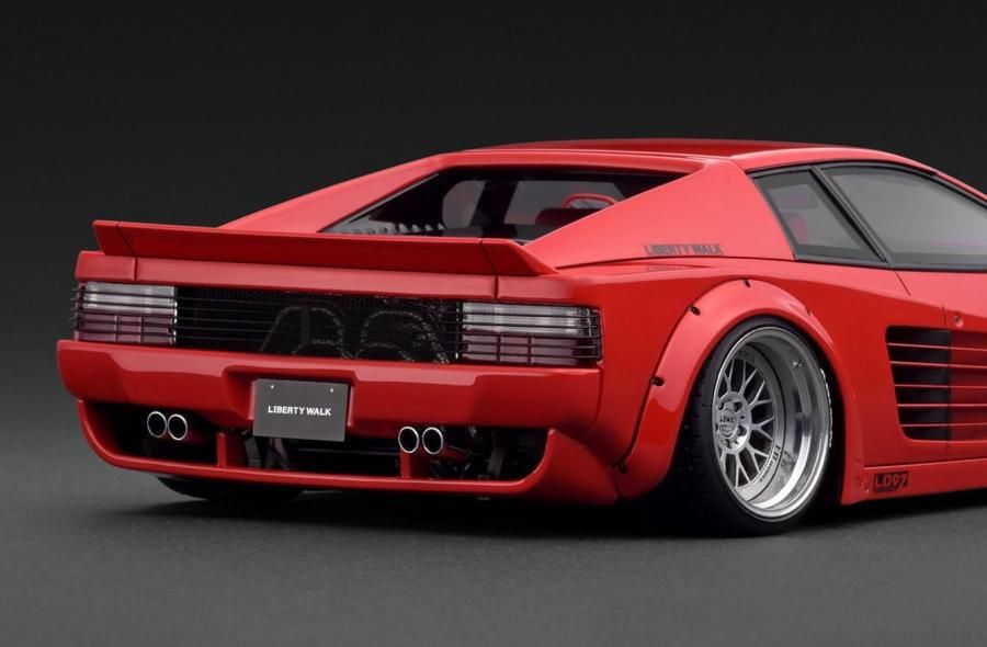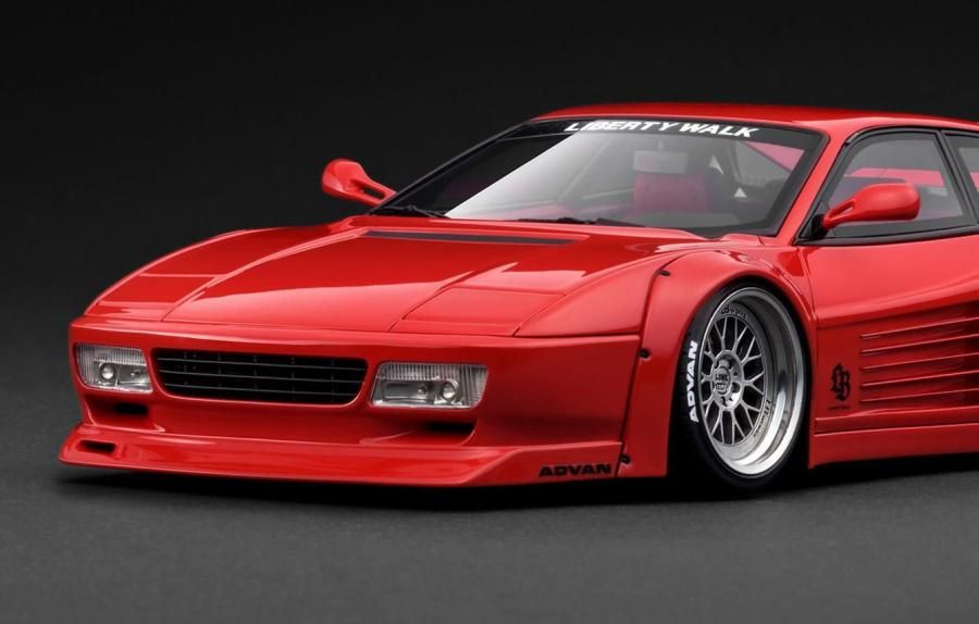 リバティウォークのデモカー「LB-WORKS 512」を1/18スケール レジンモデル素材でモデル化しました。ボディカラー:レッド。LD97 LD-12タイプ19インチホイール(ポリッシュ&シルバー)に専用ボディキット(フロントバンパー、前後オーバーフェンダー、リヤウィング)、レッドキャリパー、ボディの各所に専用デカール、ノーマルステアリング、ノーマルシート(レッド)、4本出しマフラーを装着。 ※画像は試作品です。