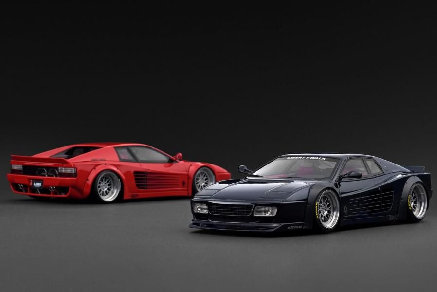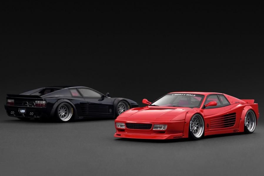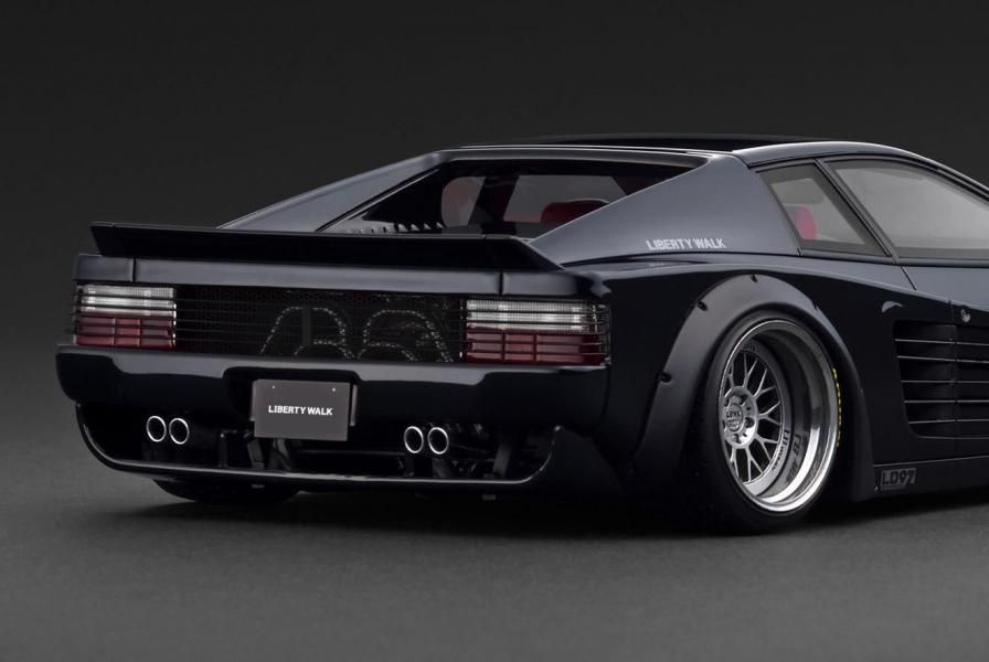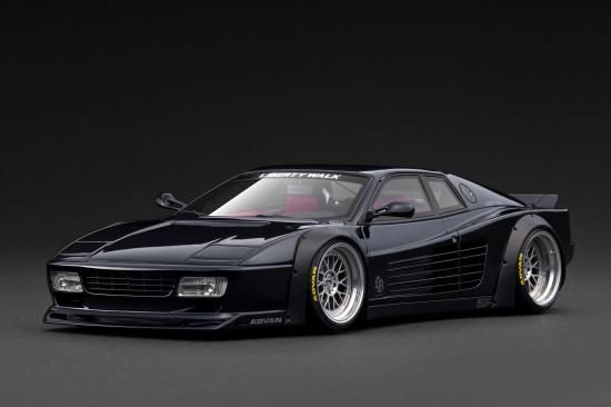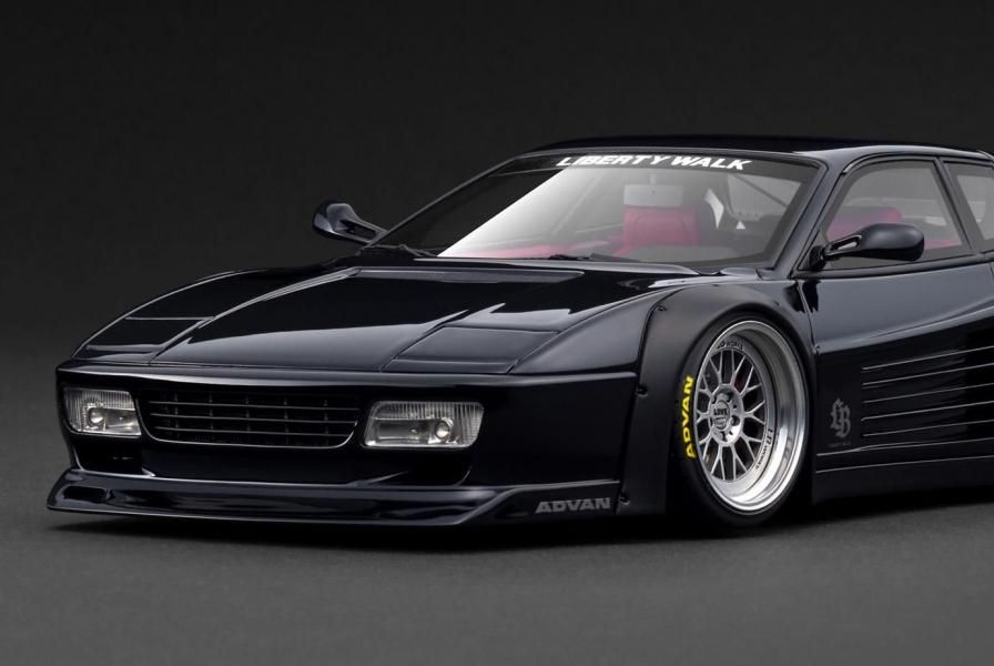 リバティウォークのデモカー「LB-WORKS 512」を1/18スケールレジンモデル素材でモデル化しました。ボディカラー:ブラック。LD97 LD-12タイプ 19インチホイール(ポリッシュ&シルバー)に専用ボディキット(フロントバンパー、前後オーバーフェンダー、リヤウィング)、レッドキャリパー、ボディの各所に専用デカール、ノーマルステアリング、ノーマルシート(レッド)、4本出しマフラーを装着。 ※画像は試作品です。