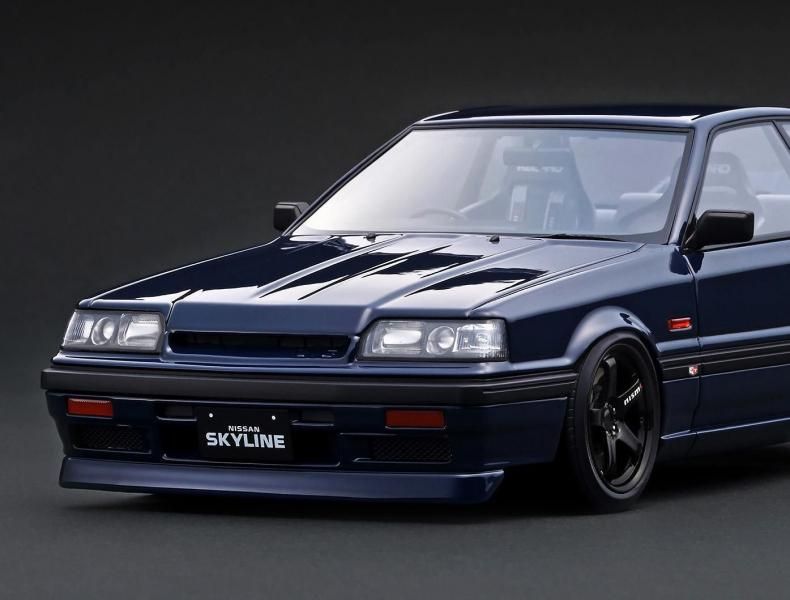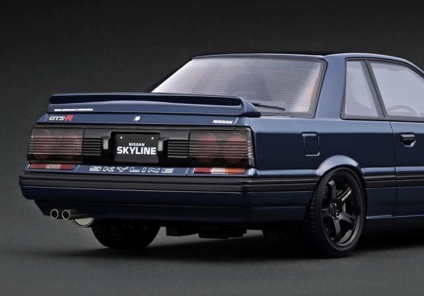 Skyline GTS-R (R31)」を1/18スケールレジンモデルで再現。ボディカラー:ブルーブラック。LMGT4 18インチホイール(ブラック)にローダウン仕様。純正フロントリップスポイラー、純正リヤスポイラー、デュアルマフラー、大型ブレーキキャリパー(ゴールド)、ナルディタイプステアリング、NISMOシートベルト、レカロ製バケットシート装着。 ※画像は試作品です。
