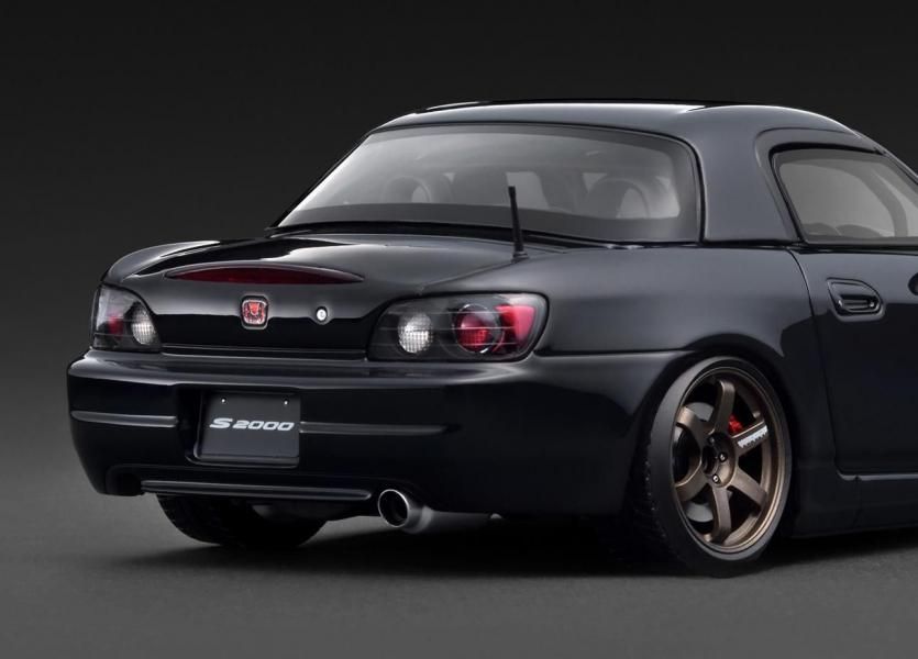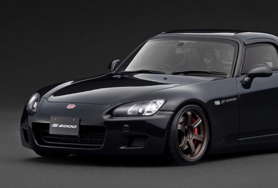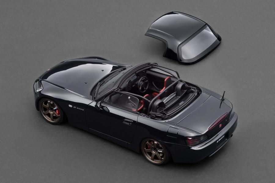「S2000 (AP1)」を1/18スケール レジン素材でモデル化。ボディカラー:ブラック。TE37 タイプ17インチホイール(ブロンズ)にローダウン仕様。純正サイドステップ、レッドキャリパー、シングルマフラー、内装にレカロシート(レッド)、6点ロールバー、MOMOタイプステアリングを装着。ハードトップはマグネットで脱着可能なパーツを2種類準備。オープン&クローズの2つの仕様をお楽しみいただけます。 ※画像は試作品です。