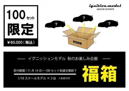 イグニッションモデルのコレクターの皆さんへ、日頃の感謝をこめて秋のお楽しみ企画「福箱」をご用意しました。福箱には1/18スケール製品に限り、異なる車種の製品が3台同梱となります。さらに「おまけ」付。販売価格¥60,000(税込)のワンプライスです。お得な IGモデルの「福箱」をゲットしてオータム コレクションをお楽しみください!