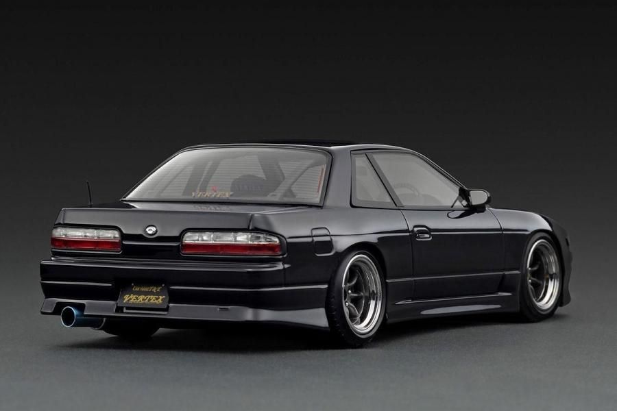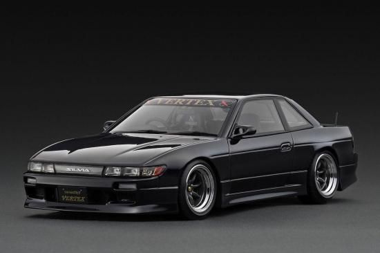 「VERTEX S13 Silvia 」を1/18スケールレジンモデルで再現。ワタナベエイトスポーク16インチ(ポリッシュ&ガンメタリック)にローダウン仕様。VERTEX製エアロパーツ(フロントバンパー、サイドステップ、リヤバンパー)を装着。フロントウィンドウハチマキとリヤウィンドウ下部に「VERTEX」ロゴ、大径シングルマフラー(チタンカラー)、VERETX製品バケットシート、VERTEX製ステアリングを装着。 ※画像は試作品です。