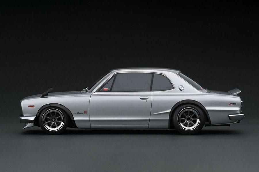 「ハコスカ2ドアGT-R (KPGC10)」のライトカスタム仕様を1/18スケールレジンモデルで再現。RSワタナベ15インチホイール(ポリッシュ&ガンメタリック)にローダウン仕様。フロントリップスポイラー、前後オーバーフェンダー(マットブラック)、ディアルマフラー、純正ハンドル、純正シートを装着。ウィンドウ部に「OK」「有鉛」シールを再現。※画像は試作品です。