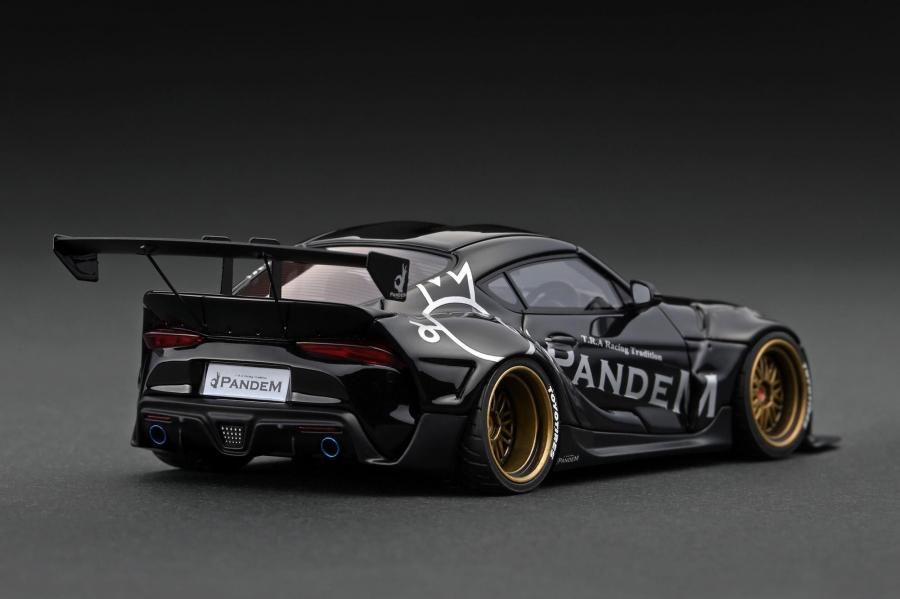ロケットバニー(パンデム)スープラ(A90)を1/43スケール レジンモデルでモデル化。BBS LMタイプ20インチホイール(ゴールド)装着。大型ブレーキキャリパーにロールバー、GTウイング、チタンカラーの大径マフラー、ボディ各所にPANDEMロゴ、バケットシートを装着。